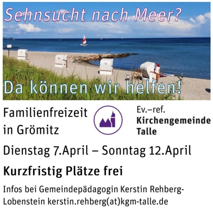 Die Ev.-ref. Kirchengemeinde Talle lädt Familien, Paare,Singles - jung und alt herzlich zur gemeinsamen Freizeit im CVJM-Feriendorf Grömitz ein.