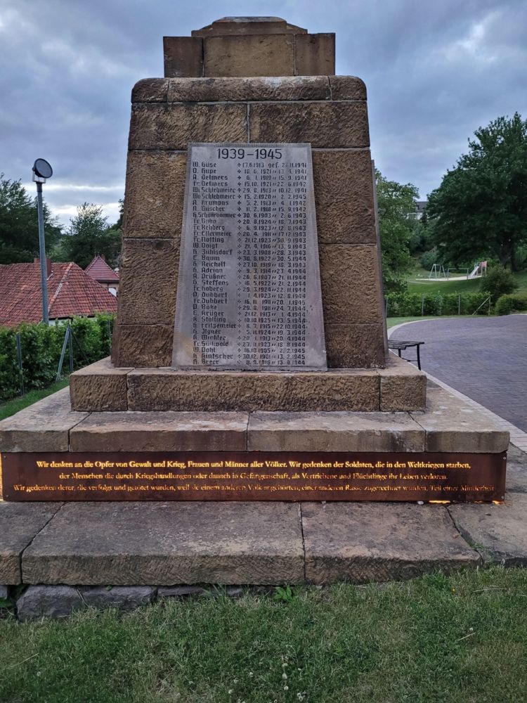 Mit dem zeitlichen Abstand von 70 Jahren Frieden und doch in dem Wissen, dass Krieg, Gewalt, Ächtung, Ausgrenzung überall auf der Welt immer noch Leid über Menschen bringt, sehen wir unsere Aufgabe heute darin, diesem Denkmal den Charakter eines Mahnmals zu geben. Deshalb wurden 2021 am Sockel moderne Cortenstahlplatten angebracht mit der Inschrift