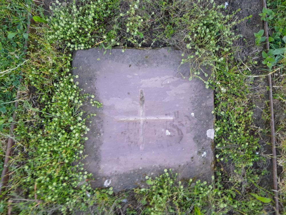 In die Sandsteinplatte, die aus dem ehemaligen Fußbodenbelag der Kirche stammt, wurde von der Fa. Dornfeld während der Bauarbeiten ein Kreuz eingearbeitet. Darunter liegen die bei den Arbeiten rund um die Neugestaltung des Kirchhofs und die während der Bodenarbeiten im Inneren der Kirche gefundenen und gesammelten Knochen. Sie wurden von Pastor Rosenau nach Abschluss der Arbeiten 2020 hier bestattet.