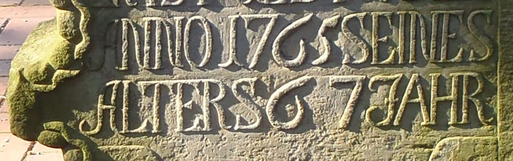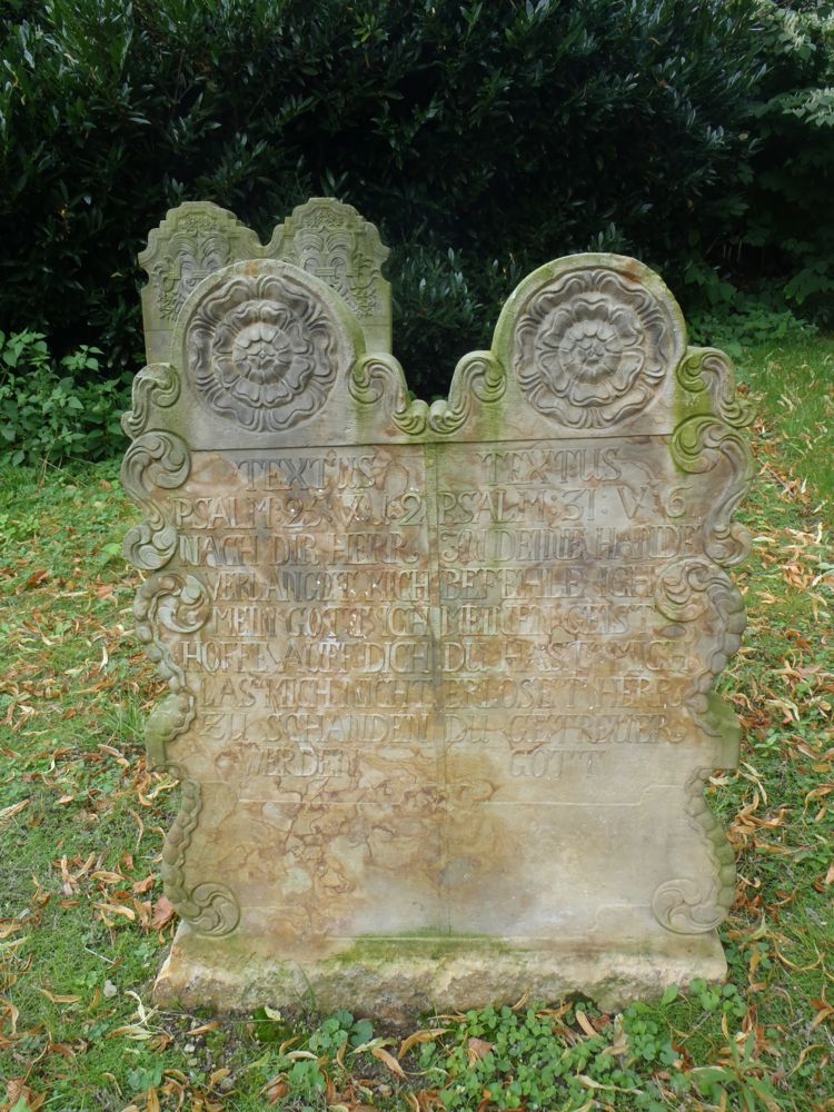 Dieses Doppelgrabmal, oben mit zwei Engelköpfen und an den Seiten mit geschwungenen Formen verziert, ist wohl einer der schönsten erhaltenen Steine. Auffallend sind auch die schlanken, sorgfältig ausgeführten Buchstaben. (Quelle: Nicolas Rügge, Die Grabsteine an der Kirche in Talle)