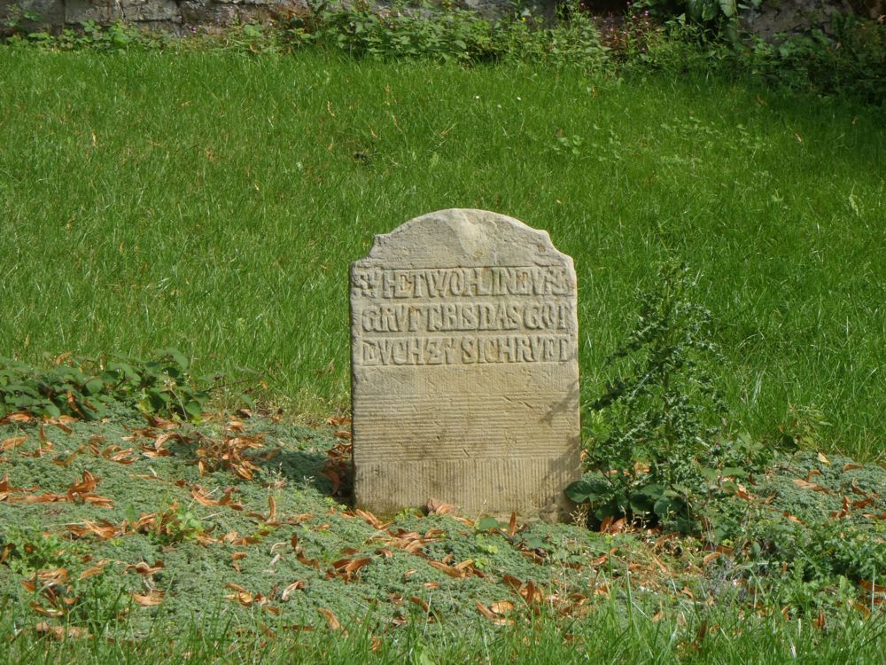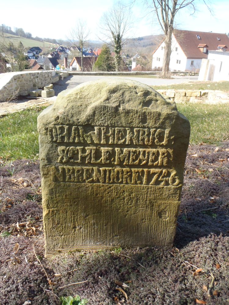 Zu diesem kleinen, schlichten Stein wurde eine andere Herkunft vermutet. Bei der Bergung kam jedoch auch die untere Zeile zum Vorschein, die die Familie nach Brüntorf verortet. Dieser Stein ist vermutlich auch "nur" ein Lagerstein zur Kennzeichnung der Stelle für das Familienbegräbnis, auch wenn die Rückseite bereits einen Text enthält. Es ist weder Geburts- noch Sterbedatum vermerkt. (Quelle: Thomas Kriete, Lagersteine - die besonderen Grabsteine)