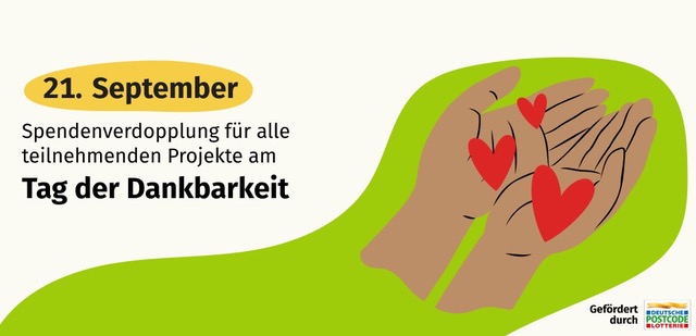 Um diese wertvolle Arbeit sichtbar zu machen und zu stärken, erhalten alle gemeinnützigen Projekte mit ihrem Projektort in Deutschland auf unserer Plattform am 21. September 2025 zusätzliche Unterstützung: Während dieses Zeitraums wird jede Einzelspende bis 50 € für teilnehmende Projekte dank einer Förderung der Deutschen Postcode Lotterie verdoppelt – bis der Spendentopf von 100.000 € aufgebraucht ist.*